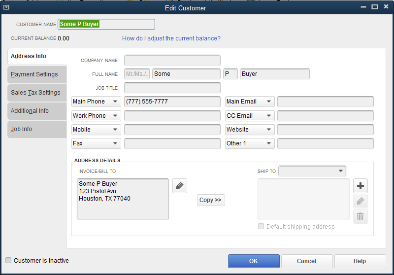 Note: FFL Tools does not insert any values in the Additional Info or Job Info tabs when new Customers are created. If information for these tabs are used in your operations you will need to edit the Customer within QuickBooks.